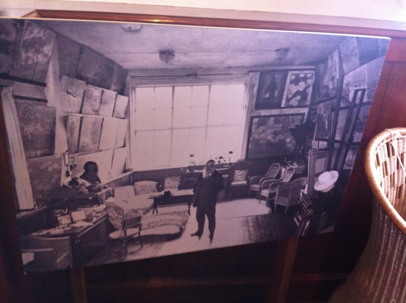 Monet em sua sala de pintura, parcialmente preservada em seu Museu. Ele se casou com Camille, depois mudou-se para Paris com ela e seus filhos. Em 1878, em férias com o casal Hoschédé, apaixonou-se pela esposa de Hoschédé, Alice. Um ano depois sua esposa Camille morreu de câncer e ele se mudou para Giverny em 1883. Ele se correspondia com Alice, e um ano após a morte de seu marido, em 1891, os dois se casaram.