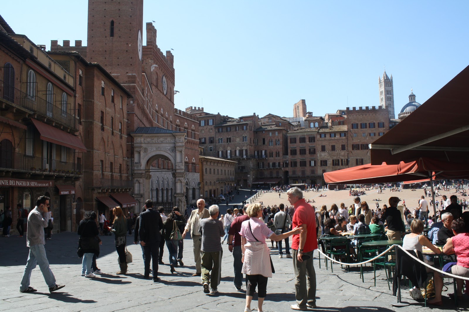 Piazza del Campo em forma de meia lua Gente demais, mas um visual magnífico. E estávamos fora de época de férias!